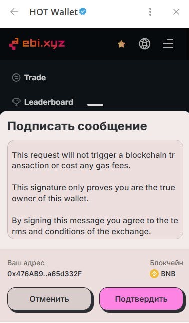 Теперь терминал биржи EBI откроется прямо в Телеграм-кошельке Hot Wallet. Справа вверху кликаем на три полоски и выбираем «Sign In». А потом нажимаем «Start Exploring» или «Skip», если заходим без реферального кода. После этого смело жмем «Подтвердить».