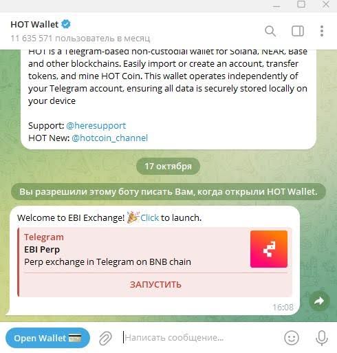 Итак, мы нажали Hot Wallet на ebi xyz. Теперь подтверждаем подключение кошелька для криптовалют на EBI. Переходим в ТГ-чат Хот Валлет, а там нас уже ждет приглашение от биржи. Нажимаем «Запустить».
