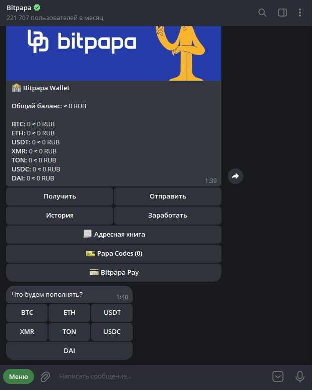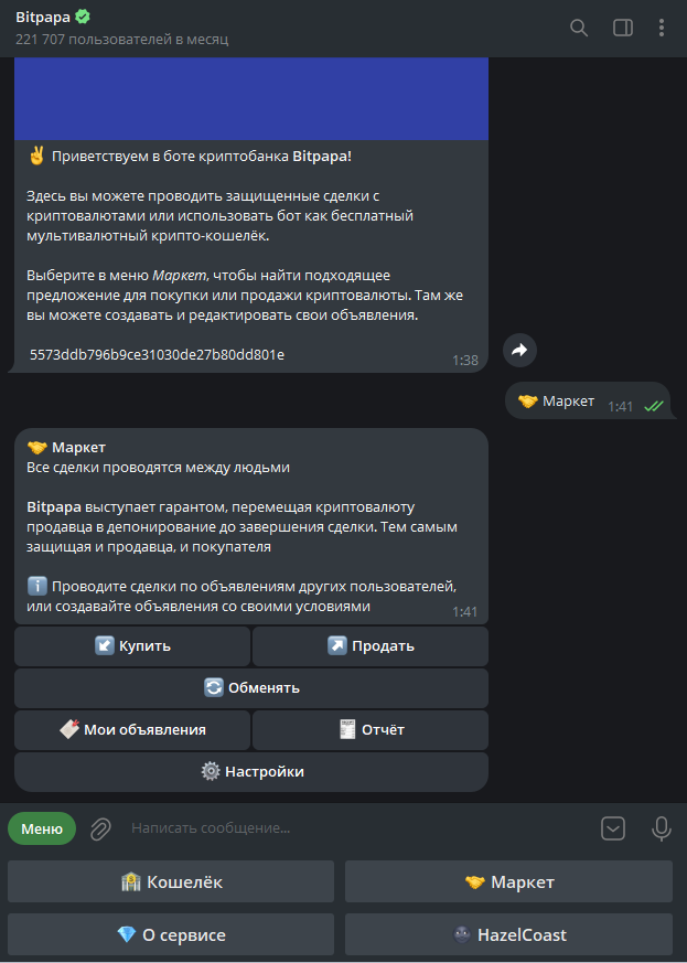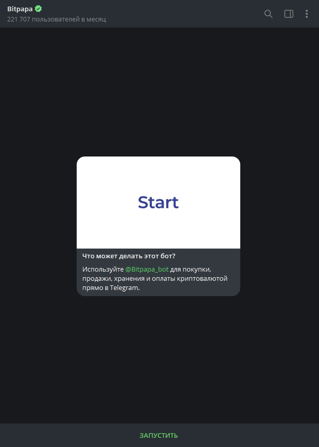 P2P боты в Телеграме могут отличаться оформлением, меню, наличием дополнительных функций и другими незначительными аспектами, но в большинстве случаев криптовалютные транзакции в них проходят по одному сценарию. Рассмотрим его на примере популярного P2P канала Bitpapa.