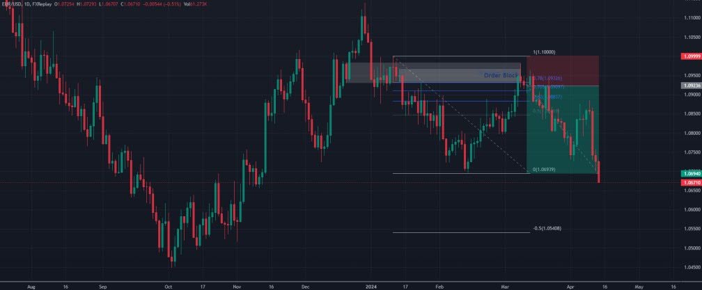 Включаем расширение Фибоначчи с нашими настройками для ОТЕ – от последнего пика до минимума. Примечательно, что ОТЕ сейчас совпал с большущей свечой FVG. Это еще раз подтверждает наш прогноз.