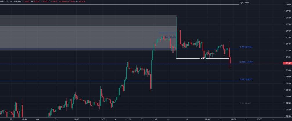 Перейдя на часовик, наблюдаем формирование паттерна MSS. В купе с блоком ордеров и блоком прерывателя он подтверждает, что на ОТЕ цена и правда собирается повернуть. Намечается стандартное отклонение.