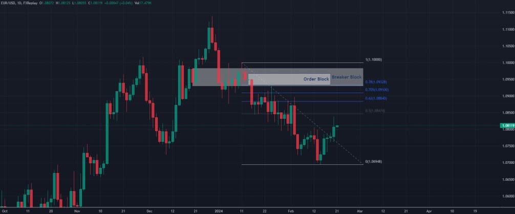 Рыночные условия таковы: евро по отношению к доллару долгое время летел вверх. Но потом он начал корректироваться и пошел на убыль. Как видно на изображении, после коррекции цена отскочила от линии 61.8% сетки Фибоначчи. Это один из характерных для ОТЕ уровней. Участие здесь «китов» Smart Money подтверждает большая импульсная волна – длинная зеленая свечка.