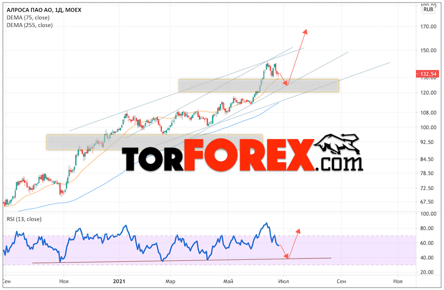 Таким образом, Акции АЛРОСА прогноз на 28 июня — 2 июля 2021 предполагает попытку теста области поддержки вблизи уровня 125.05. Далее, продолжение роста котировок ALRS с целью выше уровня 170.05. Отменой варианта подъёма цены акций АЛРОСА выступит падение и пробой уровня 110.05. Это укажет на пробой нижней границы канала. В этом случае стоит ожидать продолжения снижения ниже уровня 85.05.