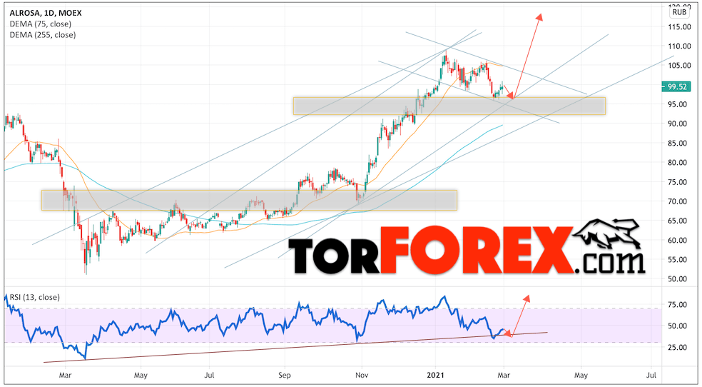 Таким образом, Акции АЛРОСА прогноз на неделю 1 — 5 марта 2021 предполагает попытку теста области поддержки вблизи уровня 96.45. Далее, продолжение роста котировок ALRS с целью выше уровня 120.05. Отменой варианта подъёма цены акций АЛРОСА выступит падение и пробой уровня 90.05. Это укажет на пробой нижней границы канала. В этом случае стоит ожидать продолжения снижения ниже уровня 80.55.