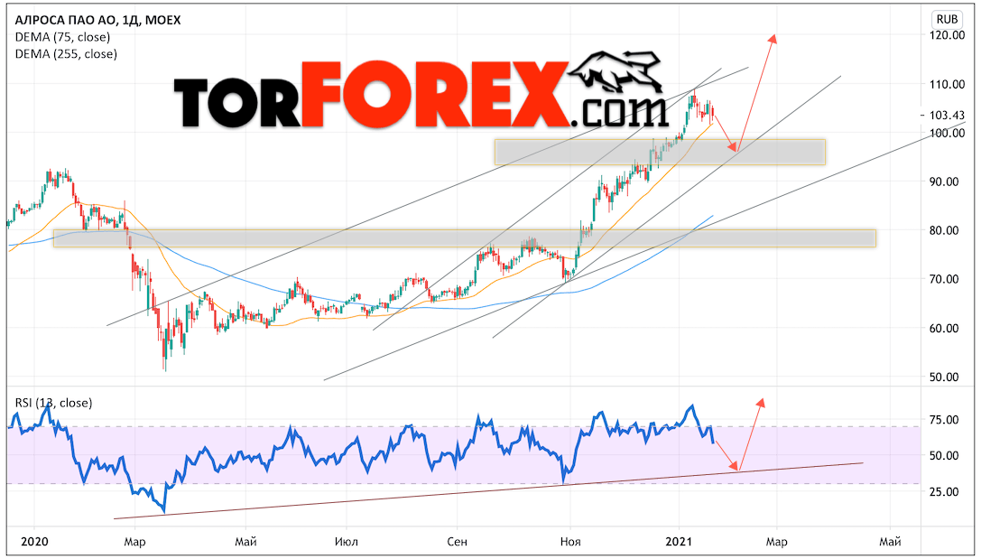 Таким образом, Акции Алроса прогноз на неделю 25 — 29 января 2021 предполагает попытку теста области поддержки вблизи уровня 97.65. Далее, продолжение роста котировок ALRS с целью выше уровня 120.05. Отменой варианта подъёма цены акций Алроса выступит падение и пробой уровня 95.00. Это укажет на пробой нижней границы канала. В этом случае стоит ожидать продолжения падения к уровню 75.00.