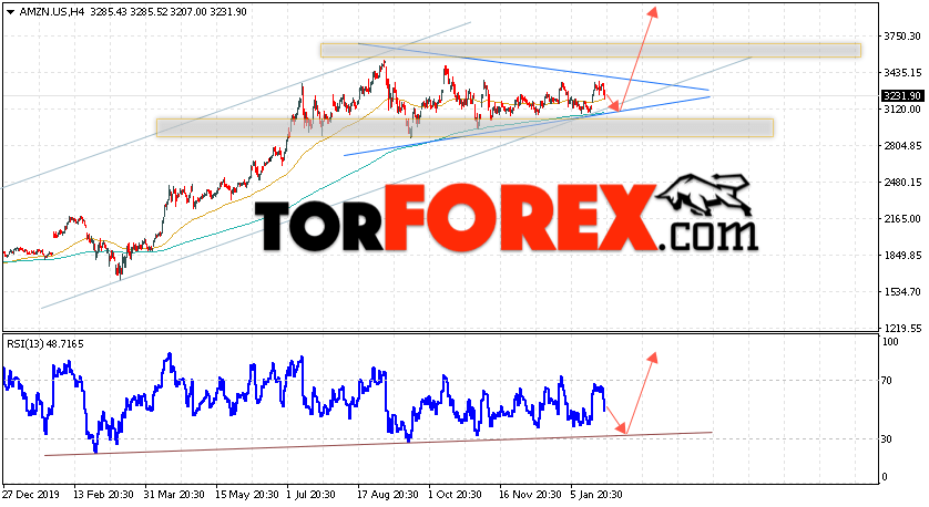 Дополнительным сигналом в пользу роста котировок Amazon выступит тест линии поддержки на индикаторе относительной силы (RSI). Вторым сигналом станет отскок от нижней границы модели ”Треугольник”. Отменой варианта роста котировок стоимости акций компании Amazon станет падение и пробой уровня 2905.00. Это укажет на пробой нижней границы модели ”Треугольник” и продолжение падения в область на уровне 2185.00. Ожидать ускорения роста стоит с пробоем области сопротивления и закрытием выше уровня 3495.00, что укажет на пробой верхней границы модели ”Треугольник”.