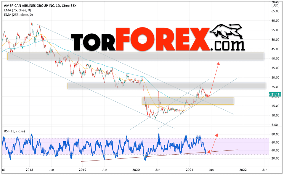 Таким образом, Акции American Airlines прогноз на 26 — 30 апреля 2021 предполагает попытку теста области поддержки вблизи уровня 20.55. Далее, продолжение роста котировок AAL с целью выше уровня 37.05. Отменой варианта подъёма цены акций American Airlines выступит падение и пробой уровня 14.05. Это укажет на пробой нижней границы восходящего канала. В этом случае стоит ожидать продолжения снижения к уровню 10.05.