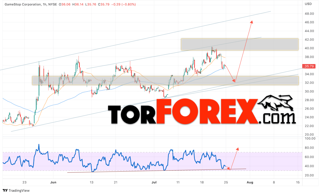 Дополнительным сигналом в пользу роста котировок GameStop выступит тест линии поддержки на индикаторе относительной силы (RSI). Вторым сигналом станет отскок от нижней границы нисходящего канала. Отменой варианта роста котировок стоимости акций компании GameStop станет падение и пробой уровня 28.05. Это укажет на пробой области поддержки и продолжение падения в область на уровне 22.55. Ожидать ускорения подъёма акций стоит с пробоем области сопротивления и закрытием выше уровня 42.55.