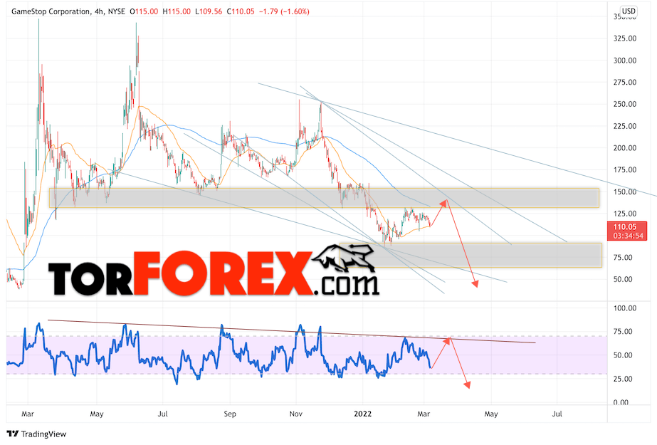 Дополнительным сигналом в пользу падения котировок GameStop выступит тест линии сопротивления на индикаторе относительной силы (RSI). Вторым сигналом станет отскок от верхней границы нисходящего канала. Отменой варианта падения котировок стоимости акций компании GameStop станет сильный рост и пробой уровня 155.05. Это укажет на пробой области сопротивления и продолжение подъёма в область на уровне 175.05. Ожидать ускорения падения акций стоит с пробоем области поддержки и закрытием ниже уровня 70.05, что укажет на пробой нижней границы модели ”Флаг”.