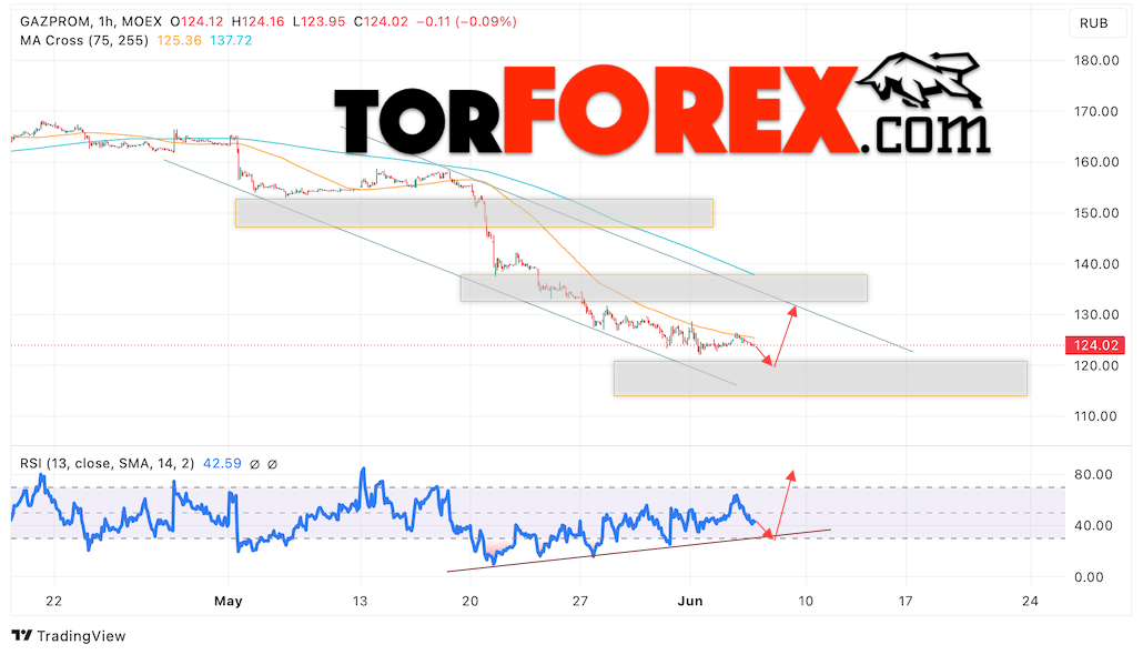 Дополнительным сигналом в пользу роста котировок GAZP выступит тест бычьей линии тренда на индикаторе относительной силы. Вторым сигналом выступит отбой от уровня поддержки. Отменой варианта подъёма стоимости акций Газпром станет падение и пробой уровня 115. Это укажет на пробой области поддержки и продолжение снижения котировок в область ниже уровня 100. Ожидать подтверждения подъёму котировок GAZP стоит с пробоем области сопротивления и закрытием выше уровня 125.