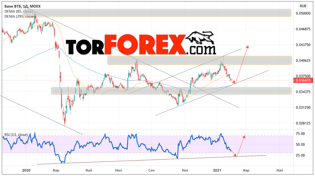 Котировки акций компании Газпром продолжает движение в рамках коррекции и начала отработки разворотной модели ”Двойное дно”, как правило, цены могут протестировать верхнюю границу данной модели перед продолжением подъёма. В момент публикации прогноза цена акций Газпром составляет 212.83. Скользящие средние указывают на наличие бычьей тенденции. Цены ушли вверх от области между сигнальными линиями, что указывает на давление со стороны покупателей актива. На данный момент стоит ожидать попытку снижения курса акций и тест уровня поддержки вблизи области 205.00. Затем отскок и начала роста стоимости акций в область выше уровня 240.00.