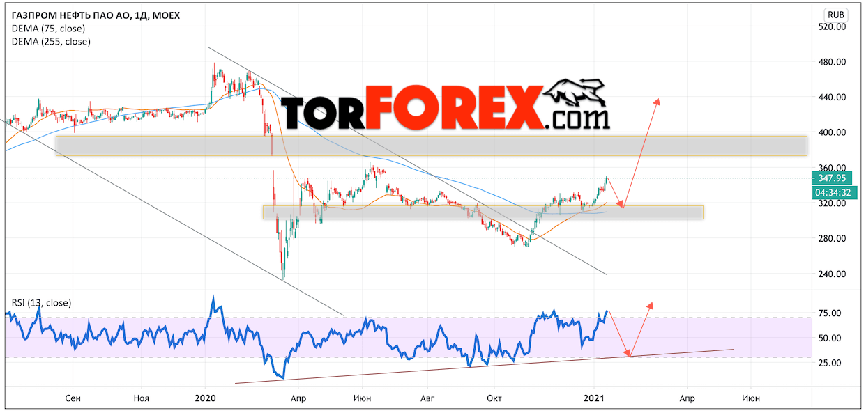 Котировки акций компании Газпром продолжает движение в рамках роста и начала отработки разворотной модели ”Двойное дно”. В момент публикации прогноза цена акций Газпром составляет 347.95. Скользящие средние указывают на наличие бычьей тенденции. Цены ушли вверх от области между сигнальными линиями, что указывает на давление со стороны покупателей актива. На данный момент стоит ожидать попытку снижения курса акций и тест уровня поддержки вблизи области 315.00. Затем отскок и начала роста стоимости акций в область выше уровня 440.0.