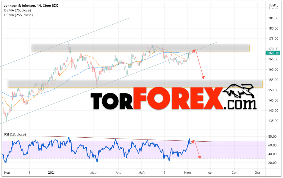 Дополнительным сигналом в пользу падения котировок Johnson & Johnson выступит тест линии сопротивления на индикаторе относительной силы (RSI). Вторым сигналом станет отскок от нижней границы восходящего канала. Отменой варианта падения котировок стоимости акций компании Johnson & Johnson станет сильный рост и пробой уровня 175.00. Это укажет на пробой области сопротивления и продолжение подъёма в область на уровне 205.05. Ожидать ускорения падения акций стоит с пробоем области поддержки и закрытием ниже уровня 160.55.