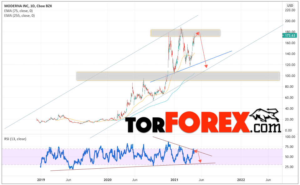 Таким образом, Акции Moderna прогноз на неделю 26 — 30 апреля 2021 предполагает попытку теста области сопротивления вблизи уровня 180.05. Далее, продолжение падения котировок MRNA с целью ниже уровня 115.05. Отменой варианта падения цены акций Moderna выступит сильный рост и пробой уровня 195.05. Это укажет на пробой верхней границы разворотной модели. В этом случае стоит ожидать продолжения подъёма к уровню 225.05.