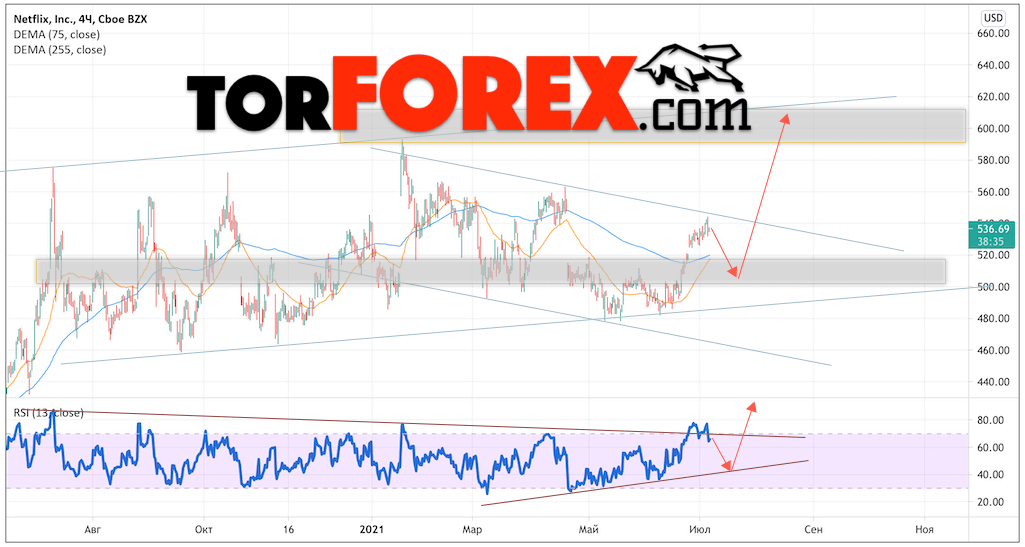 Котировки Netflix продолжают движение в рамках коррекции и бычьего канала. Скользящие средние указывают на наличие краткосрочной медвежьей тенденции по NFLX. Цены пробили область между сигнальным линиями вверх, что указывает на давление со стороны покупателей ценных бумаг. В момент публикации прогноза стоимость акций Netflix составляет 536.69. В рамках прогноза курса акций NFLX стоит ожидать попытку развития коррекции и тест уровня поддержки вблизи области 510.00. Далее, отскок вверх и продолжение подъёма стоимости ценных бумаг. Потенциальной целью такого движения выступает область выше уровня 605.05 в июле 2021 года.