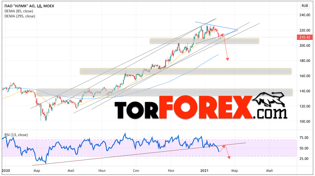 Таким образом, Акции НЛМК прогноз на неделю 1 — 5 февраля 2021 предполагает попытку теста области сопротивления вблизи уровня 215.00. Далее, продолжение падения котировок Новолипецкий металлургический комбинат с целью ниже уровня 180.05. Отменой варианта снижения цены акций выступит сильный рост и пробой уровня 225.05. Это укажет на пробой области сопротивления. В этом случае стоит ожидать продолжения роста выше уровня 255.05.