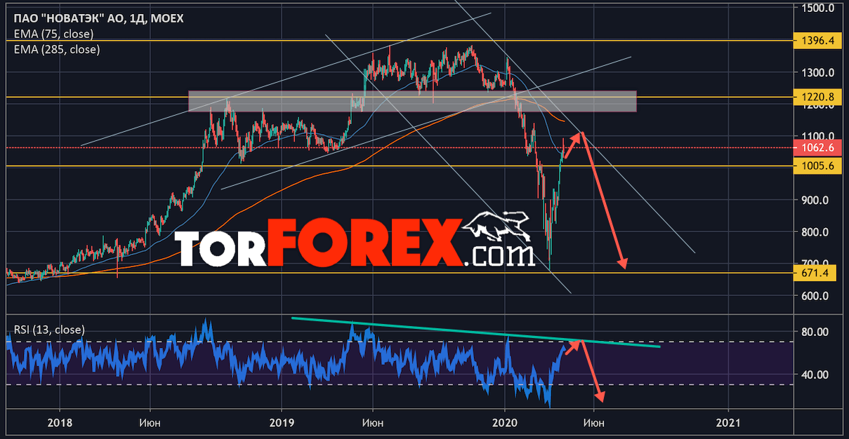 Котировки акций компании Новатэк продолжают движение в рамках роста и нисходящего канала. В момент публикации прогноза цена акций NVTK составляет 1062.6. Скользящие средние указывают на наличие медвежьей тенденции. Цены отталкиваются от области между сигнальными линиями, что указывает на давление со стороны продавцов и вероятное падение уже с текущих уровней. На данный момент стоит ожидать попытку роста и тест уровня сопротивления вблизи области 1105.0. Откуда стоит ожидать отскок и продолжения падения стоимости и курса Новатэк с целью ниже уровня 675.0.