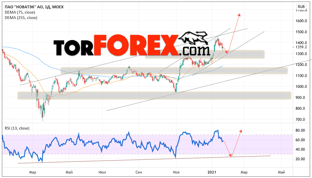 Таким образом, Акции Новатэк прогноз на неделю 25 — 29 января 2021 предполагает попытку теста области поддержки вблизи уровня 1305.0. Далее, продолжение роста котировок NVTK с целью выше уровня 1645.0. Отменой варианта подъёма цены акций Новатэк выступит падение и пробой уровня 1210.0. Это укажет на пробой нижней границы восходящего канала. В этом случае стоит ожидать продолжения снижения к уровню 1105.0.