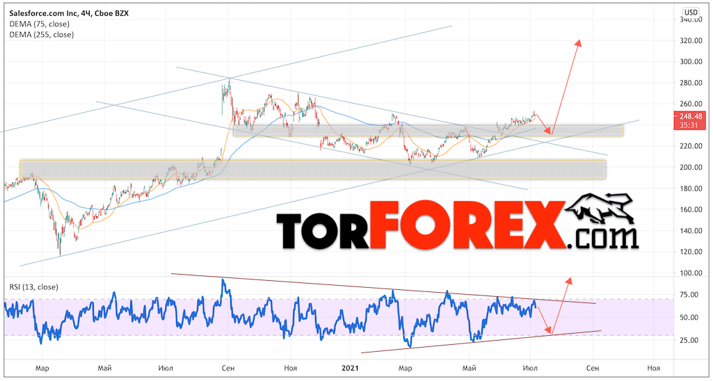 Таким образом, Акции Salesforce прогноз на июль и август 2021 предполагает развитие коррекции и тест области поддержки вблизи уровня 240.55. Откуда стоит ожидать отскок и попытку продолжения подъёма акций в область выше уровня 320.00. В пользу роста бумаг выступит тест линии тренда на индикаторе относительной силы. Отменой варианта подъёма CRM станет падение и пробой уровня 215.00. Это укажет на пробой поддержки и продолжение падения стоимости в область ниже уровня 190.55. Как видим, технический анализ акций Salesforce указывает на высокую вероятность продолжения роста с общей целью выше уровня 320.00.