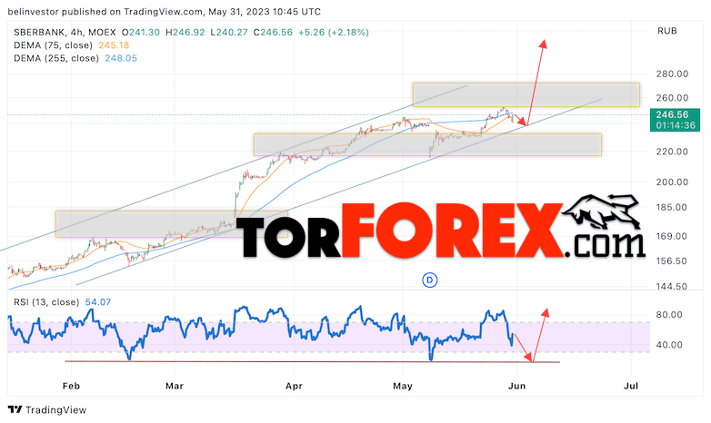Дополнительным сигналом в пользу роста котировок SBER выступит тест линии тренда на индикаторе относительной силы (RSI). Вторым сигналом выступит отбой от нижней границы бычьего канала. Отменой варианта роста стоимости акций Сбербанк станет падение и пробой уровня 235. Это укажет на пробой области поддержки и продолжение падения в область ниже уровня 220. Ожидать подтверждения росту котировок SBER стоит с пробоем области сопротивления и закрытием выше уровня 250.