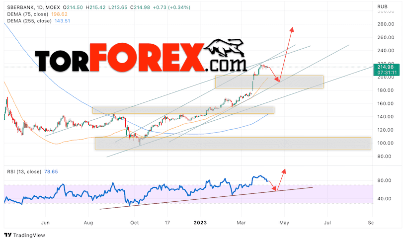 Таким образом, Акции Сбербанк прогноз на 10 — 14 апреля 2023 предполагает попытку теста области поддержки вблизи уровня 190.05. Далее, продолжение роста котировок SBER с целью выше уровня 280.05. Отменой варианта роста цены акций Сбербанк выступит падение и пробой уровня 170.05. Это укажет на пробой нижней границы бычьего канала. В этом случае стоит ожидать продолжения снижения к уровню 135.05.