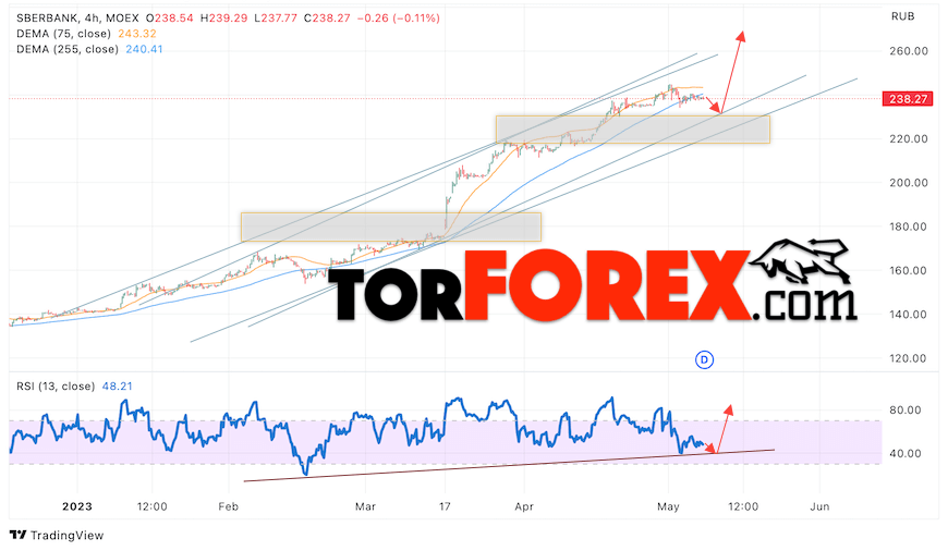 Дополнительным сигналом в пользу роста котировок SBER выступит тест линии тренда на индикаторе относительной силы (RSI). Вторым сигналом выступит отбой от нижней границы бычьего канала. Отменой варианта роста стоимости акций Сбербанк станет падение и пробой уровня 215. Это укажет на пробой области поддержки и продолжение падения в область ниже уровня 175. Ожидать подтверждения росту котировок SBER стоит с пробоем области сопротивления и закрытием выше уровня 250, что укажет на пробой верхней границы бычьего канала.