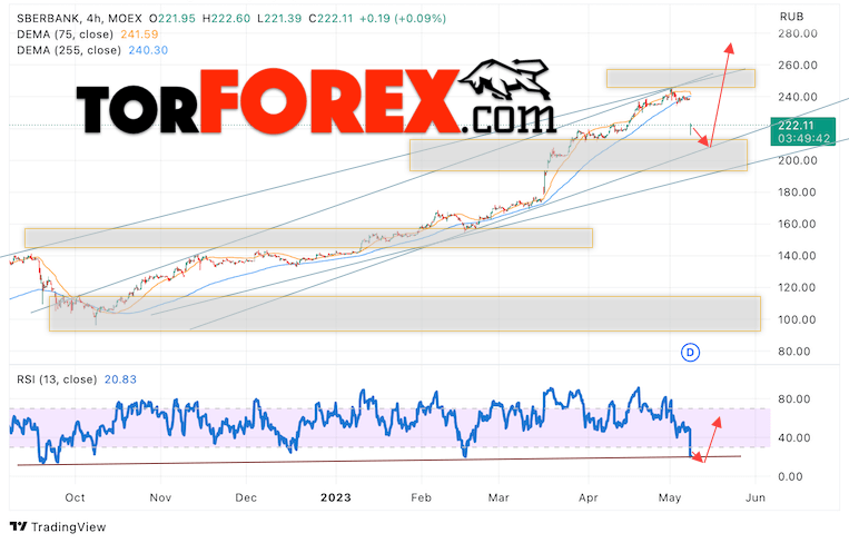 Дополнительным сигналом в пользу роста котировок SBER выступит тест линии тренда на индикаторе относительной силы (RSI). Вторым сигналом выступит отбой от нижней границы бычьего канала. Отменой варианта роста стоимости акций Сбербанк станет падение и пробой уровня 200. Это укажет на пробой области поддержки и продолжение падения в область ниже уровня 165. Ожидать подтверждения росту котировок SBER стоит с пробоем области сопротивления и закрытием выше уровня 240.