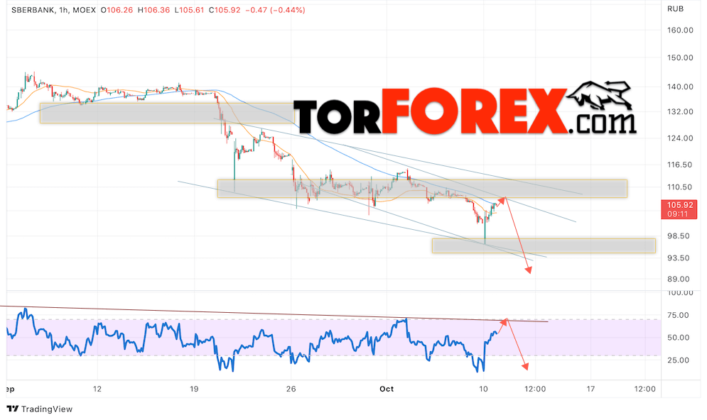 Таким образом, Акции Сбербанк прогноз на 11 октября 2022 предполагает попытку теста области сопротивления вблизи уровня 108. Далее, продолжение падения котировок SBER с целью ниже уровня 90. Отменой варианта снижения цены акций Сбербанк выступит сильный рост и пробой уровня 115. В этом случае стоит ожидать продолжения подъёма к уровню 135.