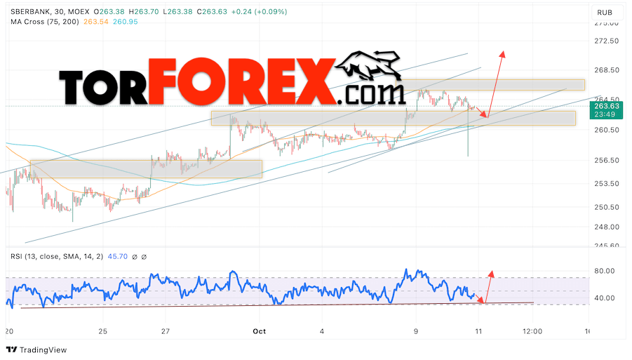 Дополнительным сигналом в пользу роста котировок SBER выступит тест линии поддержки на индикаторе относительной силы (RSI). Вторым сигналом выступит отбой от нижней границы бычьего канала. Отменой варианта роста стоимости акций Сбербанк станет падение стоимости бумаг и пробой уровня 255. Это укажет на пробой нижней границы бычьего канала и продолжение падения акций в область ниже уровня 245. Ожидать подтверждения росту котировок SBER стоит с пробоем области сопротивления и закрытием выше уровня 270.