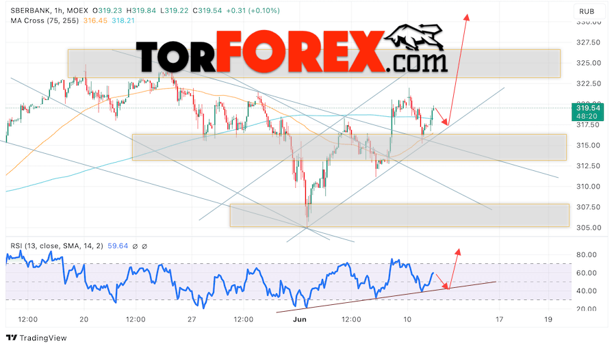 Таким образом, Акции Сбербанк прогноз на 12 июня 2024 предполагает попытку развития роста и области поддержки вблизи уровня 317. Далее, продолжение роста котировок SBER с целью выше уровня 330. Отменой варианта подъёма цены акций Сбербанк на завтра выступит падение ценных бумаг и пробой уровня 310. В этом случае стоит ожидать продолжения снижения стоимости актива к уровню 295.