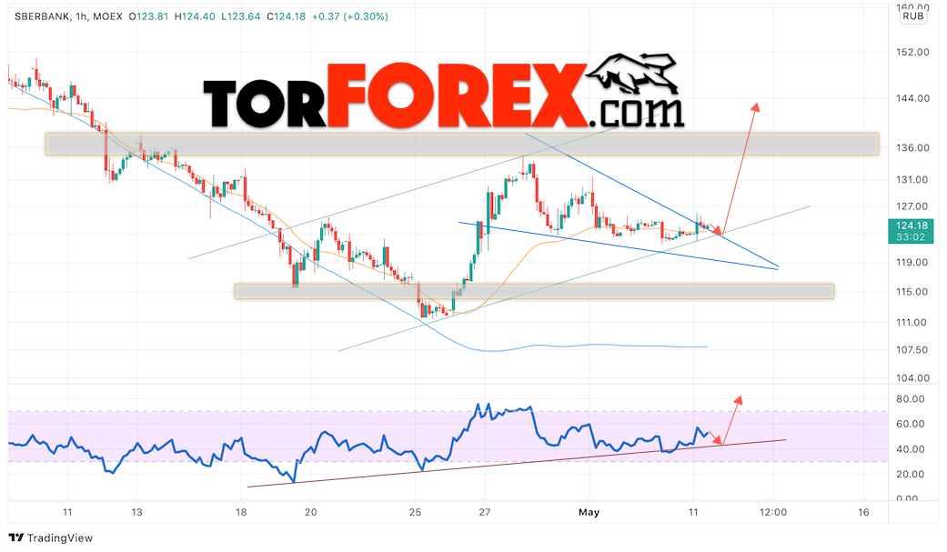 В пользу подъёма котировок SBER выступит тест бычьей линии тренда на индикаторе относительной силы. Вторым сигналом выступит отскок от верхней границы разворотной модели ”Клин». Отменой варианта роста стоимости акций Сбербанк станет падение и пробой уровня 115. Это укажет на пробой области поддержки и продолжение падения в область ниже уровня 85. Ожидать подтверждения подъёма котировок SBER стоит с пробоем области сопротивления и закрытием выше уровня 127.