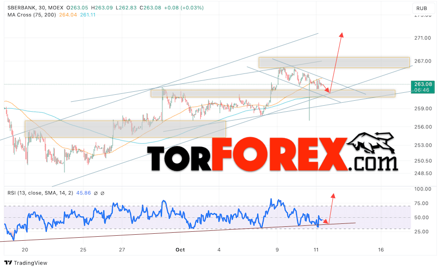 Таким образом, Акции Сбербанк прогноз на 12 октября 2023 предполагает попытку развития медвежьей коррекции и области поддержки вблизи уровня 260. Далее, продолжение роста котировок SBER с целью выше уровня 275. Отменой варианта роста цены акций Сбербанк на завтра выступит падение ценных бумаг и пробой уровня 255. В этом случае стоит ожидать продолжения падения стоимости актива к уровню 240.