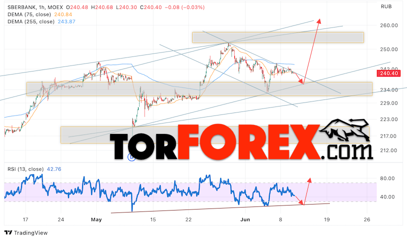 Дополнительным сигналом в пользу роста котировок SBER выступит тест линии тренда на индикаторе относительной силы (RSI). Вторым сигналом выступит отбой от нижней границы бычьего канала. Отменой варианта роста стоимости акций Сбербанк станет падение и пробой уровня 225. Это укажет на пробой области поддержки и продолжение падения в область ниже уровня 195. Ожидать подтверждения росту котировок SBER стоит с пробоем области сопротивления и закрытием выше уровня 245, что укажет на пробой верхней границы разворотной модели «Голова и плечи» и начало отработки модели с целями вверху.