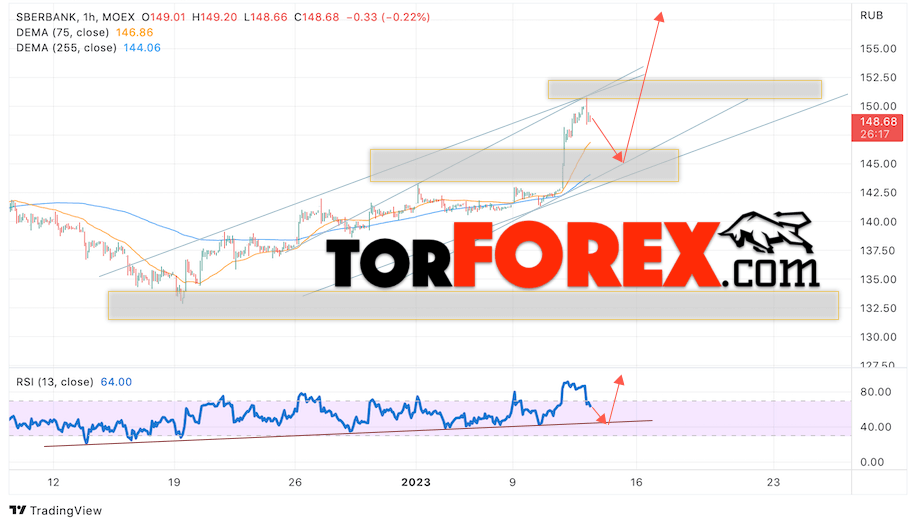 Таким образом, Акции Сбербанк прогноз на 13 января 2023 предполагает попытку теста снижения и области поддержки вблизи уровня 145. Далее, продолжение роста котировок SBER с целью выше уровня 160. Отменой варианта подъёма цены акций Сбербанк на завтра выступит падение и пробой уровня 140. В этом случае стоит ожидать продолжения снижения стоимости к уровню 130.