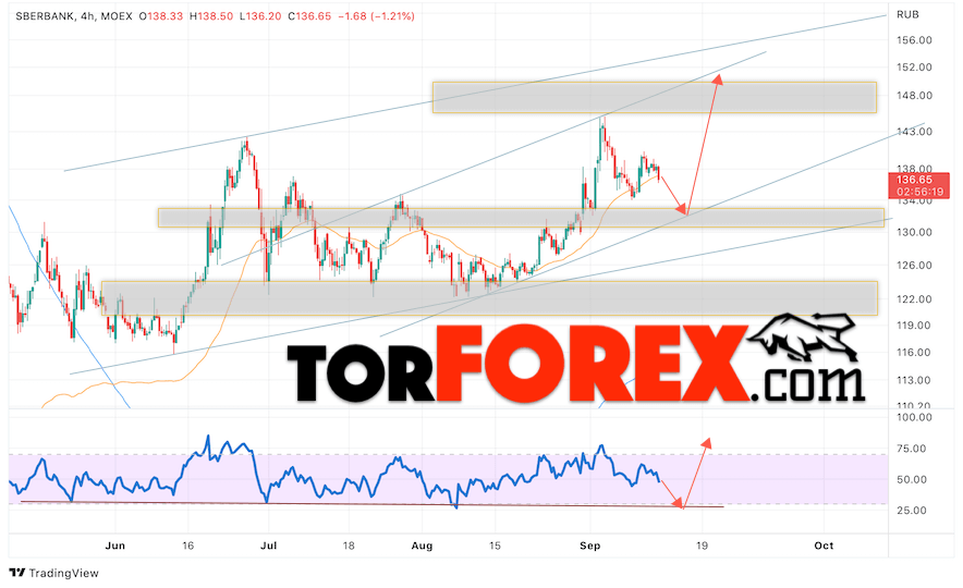 Таким образом, Акции Сбербанк прогноз на 14 сентября 2022 предполагает попытку теста области поддержки вблизи уровня 132. Далее, продолжение роста котировок SBER с целью выше уровня 150. Отменой варианта роста цены акций Сбербанк выступит падение и пробой уровня 125. В этом случае стоит ожидать продолжения снижения к уровню 110.