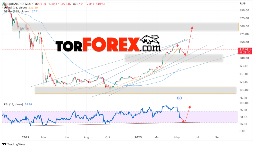 Таким образом, Акции Сбербанк прогноз на 15 — 19 мая 2023 предполагает попытку теста области поддержки вблизи уровня 215.05. Далее, продолжение роста котировок SBER с целью выше уровня 300.05. Отменой варианта роста цены акций Сбербанк выступит падение и пробой уровня 190.05. Это укажет на пробой нижней границы бычьего канала. В этом случае стоит ожидать продолжения снижения к уровню 155.05.