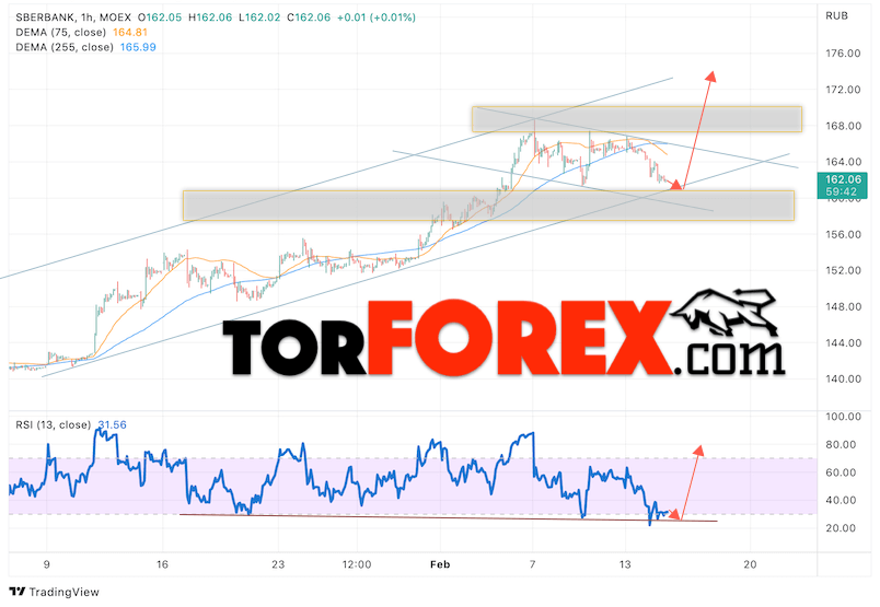 Котировки акций Сбербанк торгуется на уровне 162. Бумага продолжает движение в рамках сильной коррекции и бычьего канала. Скользящие средние указывают на наличие медвежьей тенденции по акциям компании. Цены пробили область между сигнальными линиями вниз, что указывает на давление со стороны продавцов бумаг и потенциальное продолжение падения цены акций уже с текущих уровней. В рамках прогноза курса и стоимости Сбербанк на 15 февраля 2023 стоит ожидать попытку развития коррекции стоимости бумаг и тест уровня поддержки вблизи области 160. Откуда стоит ожидать отскок вверх и продолжения роста курса акций Сбербанк с целью выше уровня 175.