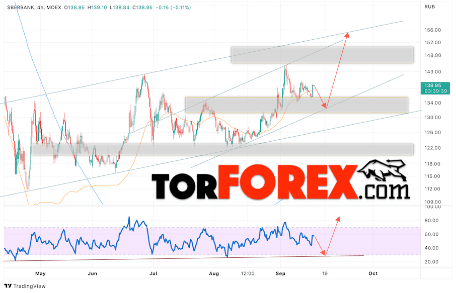 Таким образом, Акции Сбербанк прогноз на 15 сентября 2022 предполагает попытку теста области поддержки вблизи уровня 132. Далее, продолжение роста котировок SBER с целью выше уровня 155. Отменой варианта роста цены акций Сбербанк выступит падение и пробой уровня 125. В этом случае стоит ожидать продолжения снижения к уровню 110.