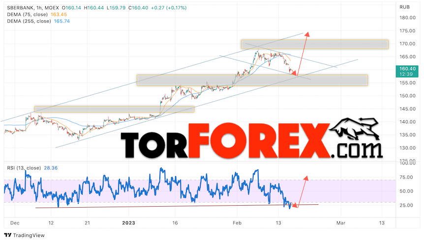 Дополнительным сигналом в пользу роста котировок SBER выступит тест бычьей линии тренда на индикаторе относительной силы (RSI). Вторым сигналом выступит отбой от нижней границы бычьего канала. Отменой варианта роста стоимости акций Сбербанк станет падение и пробой уровня 153. Это укажет на пробой области поддержки и продолжение падения в область ниже уровня 140. Ожидать подтверждения росту котировок SBER стоит с пробоем области сопротивления и закрытием выше уровня 167, что укажет на пробой верхней границы нисходящего канала коррекции.