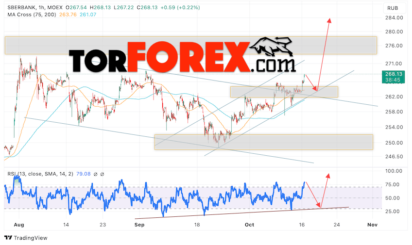 Дополнительным сигналом в пользу роста котировок SBER выступит тест линии поддержки на индикаторе относительной силы (RSI). Вторым сигналом выступит отбой от нижней границы бычьего канала. Отменой варианта роста стоимости акций Сбербанк станет падение стоимости бумаг и пробой уровня 260. Это укажет на пробой нижней границы бычьего канала и продолжение падения акций в область ниже уровня 245. Ожидать подтверждения росту котировок SBER стоит с пробоем области сопротивления и закрытием выше уровня 270.