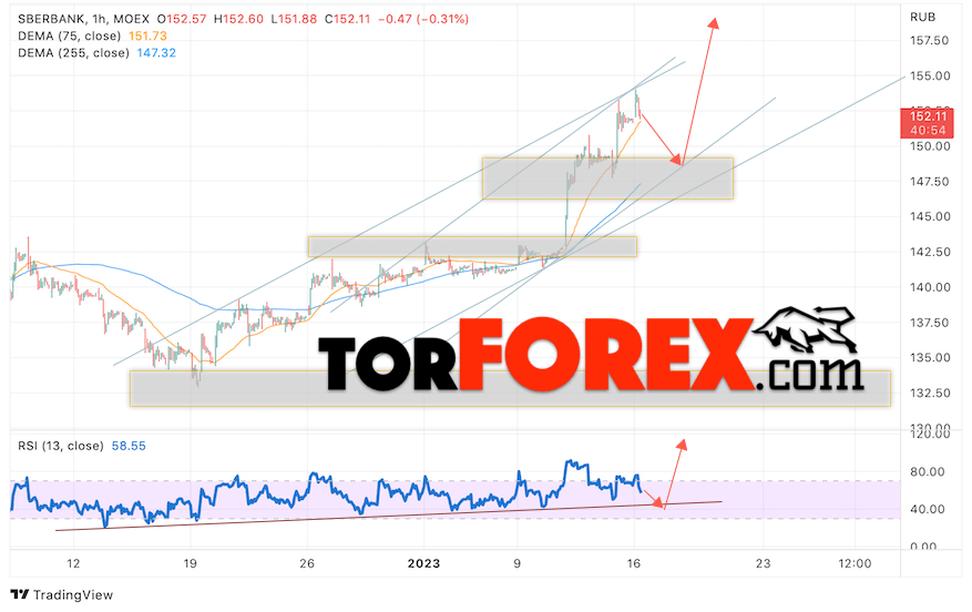 Таким образом, Акции Сбербанк прогноз на 17 января 2023 предполагает попытку теста снижения и области поддержки вблизи уровня 148. Далее, продолжение роста котировок SBER с целью выше уровня 165. Отменой варианта подъёма цены акций Сбербанк на завтра выступит падение и пробой уровня 145. В этом случае стоит ожидать продолжения снижения стоимости к уровню 135.