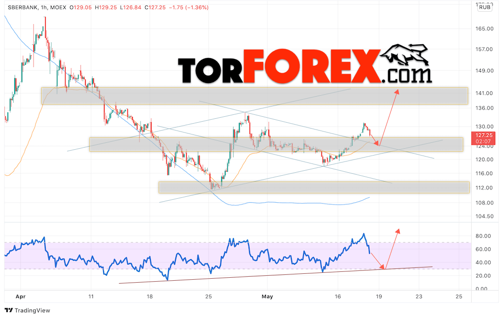 В пользу подъёма котировок SBER выступит тест бычьей линии тренда на индикаторе относительной силы. Вторым сигналом выступит отскок от верхней границы медвежьего канала. Отменой варианта роста стоимости акций Сбербанк станет падение и пробой уровня 120. Это укажет на пробой области поддержки и продолжение падения в область ниже уровня 100. Ожидать подтверждения подъёма котировок SBER стоит с пробоем области сопротивления и закрытием выше уровня 130.