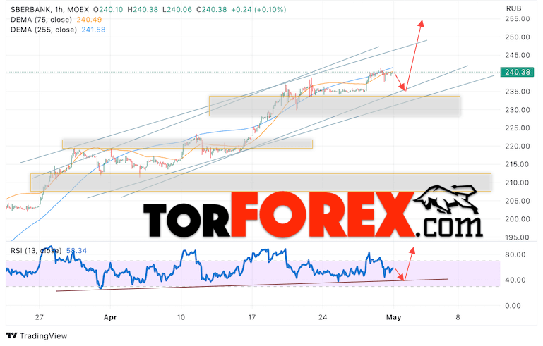 Дополнительным сигналом в пользу роста котировок SBER выступит тест линии тренда на индикаторе относительной силы (RSI). Вторым сигналом выступит отбой от нижней границы бычьего канала. Отменой варианта роста стоимости акций Сбербанк станет падение и пробой уровня 215. Это укажет на пробой области поддержки и продолжение падения в область ниже уровня 175. Ожидать подтверждения росту котировок SBER стоит с пробоем области сопротивления и закрытием выше уровня 245, что укажет на пробой верхней границы бычьего канала.