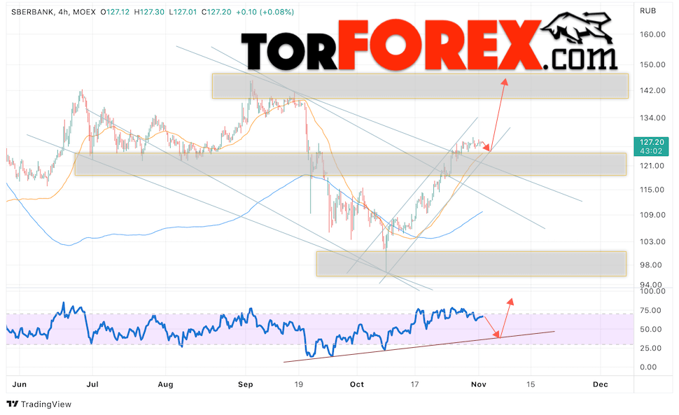 Дополнительным сигналом в пользу подъёма котировок SBER выступит тест пробитой линии тренда на индикаторе относительной силы (RSI). Вторым сигналом выступит отбой от нижней границы бычьего канала. Отменой варианта роста стоимости акций Сбербанк станет падение и пробой уровня 115. Это укажет на пробой области поддержки и продолжение падения в область ниже уровня 95. Ожидать подтверждения росту котировок SBER стоит с пробоем области сопротивления и закрытием выше уровня 130.