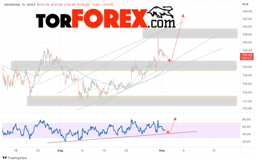 Дополнительным сигналом в пользу подъёма котировок SBER выступит тест линии поддержки на индикаторе относительной силы (RSI). Вторым сигналом выступит отскок от нижней границы бычьего канала. Отменой варианта роста стоимости акций Сбербанк станет падение и пробой уровня 127. Это укажет на пробой области поддержки и продолжение падения в область ниже уровня 115. Ожидать подтверждения роста котировок SBER стоит с пробоем области сопротивления и закрытием выше уровня 135.