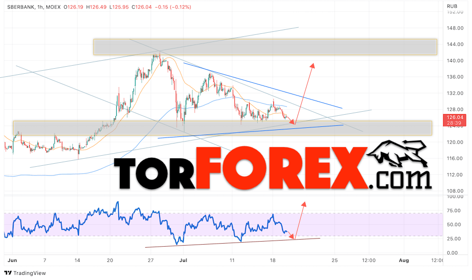 Дополнительным сигналом в пользу подъёма котировок SBER выступит тест линии поддержки на индикаторе относительной силы (RSI). Вторым сигналом выступит отскок от нижней границы модели ”Треугольник”. Отменой варианта роста стоимости акций Сбербанк станет падение и пробой уровня 120. Это укажет на пробой области поддержки и продолжение падения в область ниже уровня 105. Ожидать подтверждения росту котировок SBER стоит с пробоем области сопротивления и закрытием выше уровня 135, что укажет на пробой верхней границы модели ”Треугольник” и начало отработки этого паттерна с целями вверху.