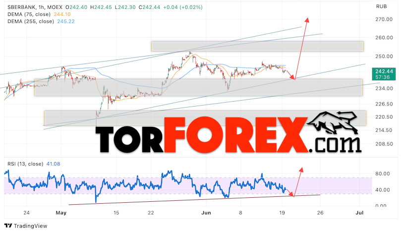 Дополнительным сигналом в пользу роста котировок SBER выступит тест линии тренда на индикаторе относительной силы (RSI). Вторым сигналом выступит отбой от нижней границы бычьего канала. Отменой варианта роста стоимости акций Сбербанк станет падение и пробой уровня 235. Это укажет на пробой области поддержки и продолжение падения в область ниже уровня 220. Ожидать подтверждения росту котировок SBER стоит с пробоем области сопротивления и закрытием выше уровня 250.