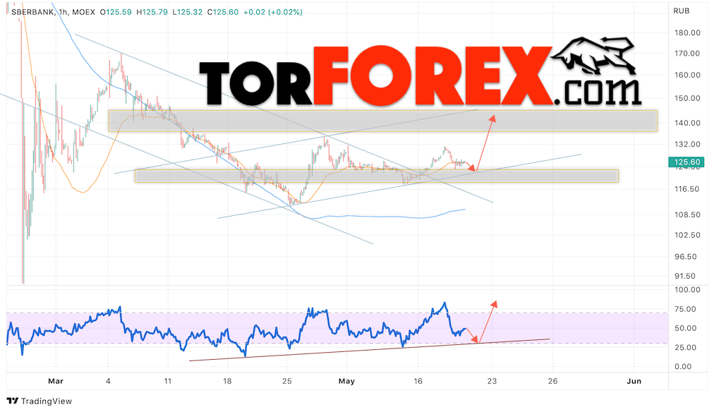 В пользу подъёма котировок SBER выступит тест бычьей линии тренда на индикаторе относительной силы. Вторым сигналом выступит отскок от верхней границы медвежьего канала. Отменой варианта роста стоимости акций Сбербанк станет падение и пробой уровня 115. Это укажет на пробой области поддержки и продолжение падения в область ниже уровня 100. Ожидать подтверждения подъёма котировок SBER стоит с пробоем области сопротивления и закрытием выше уровня 130.