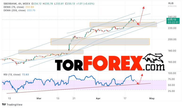 Дополнительным сигналом в пользу роста котировок SBER выступит тест линии тренда на индикаторе относительной силы (RSI). Вторым сигналом выступит отбой от нижней границы бычьего канала. Отменой варианта роста стоимости акций Сбербанк станет падение и пробой уровня 215. Это укажет на пробой области поддержки и продолжение падения в область ниже уровня 175. Ожидать подтверждения росту котировок SBER стоит с пробоем области сопротивления и закрытием выше уровня 245, что укажет на пробой верхней границы бычьего канала.