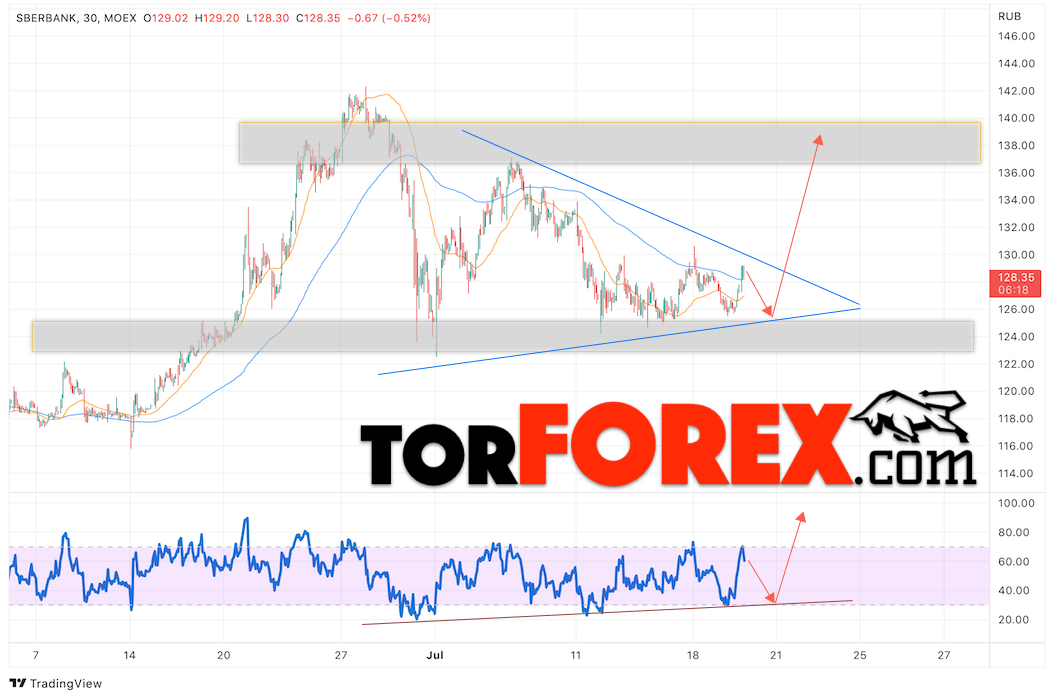 Дополнительным сигналом в пользу подъёма котировок SBER выступит тест линии поддержки на индикаторе относительной силы (RSI). Вторым сигналом выступит отскок от нижней границы модели ”Треугольник”. Отменой варианта роста стоимости акций Сбербанк станет падение и пробой уровня 120. Это укажет на пробой области поддержки и продолжение падения в область ниже уровня 105. Ожидать подтверждения росту котировок SBER стоит с пробоем области сопротивления и закрытием выше уровня 135, что укажет на пробой верхней границы модели ”Треугольник” и начало отработки этого паттерна с целями вверху.